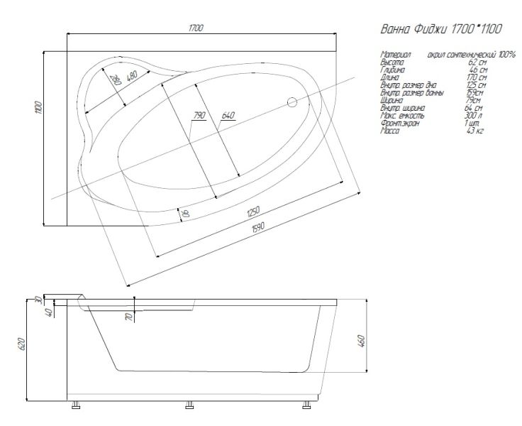 Акриловая ванна АКВАТЕК ФИДЖИ 170x110 см левая