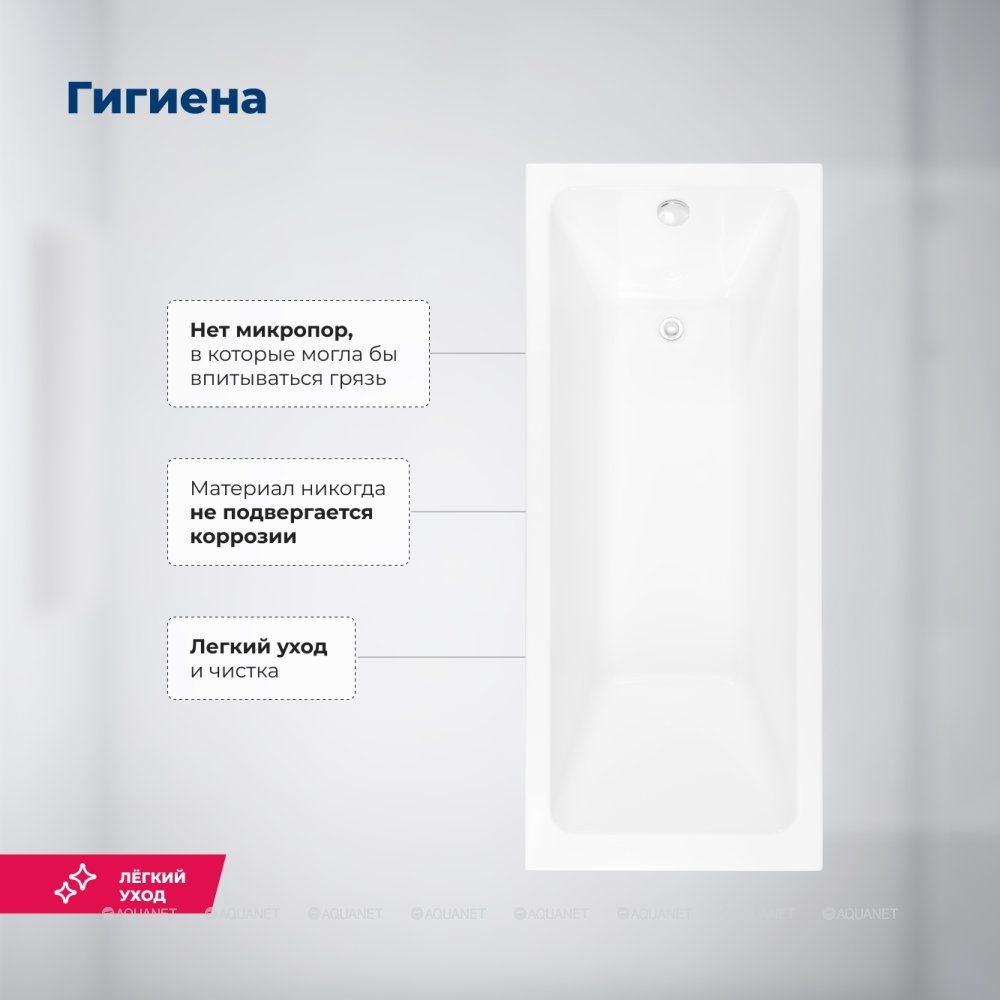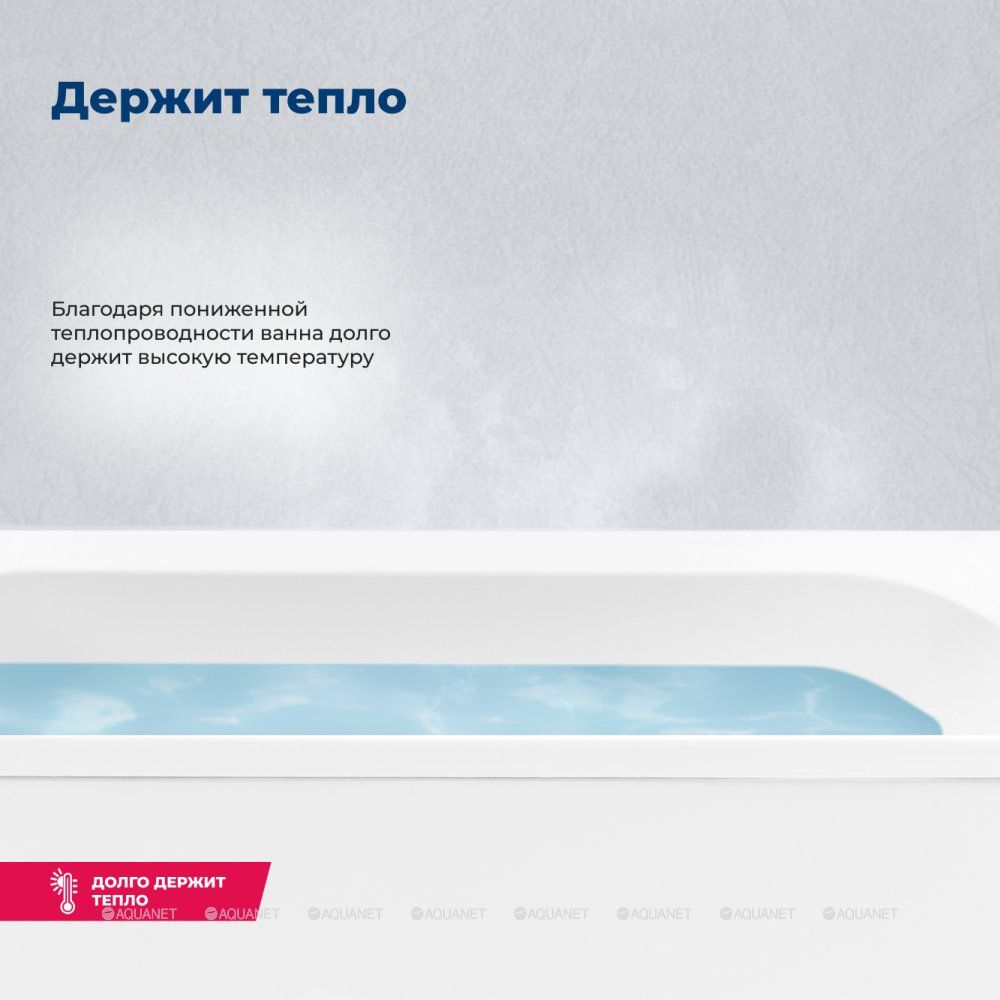 Прямоугольная ванна имеет глянцевую белоснежную поверхность, устойчивую к появлению внешних дефектов. Произведена ванна из высококачественного материала – сантехнического акрила, обладающего теплостойкими и антибактериальными свойствами. Ванна укреплена двойным составом из стекловолокна и полиэфирной смолы. В местах несущих нагрузку, имеется дополнительное укрепление в виде закладных из МДФ-плиты.