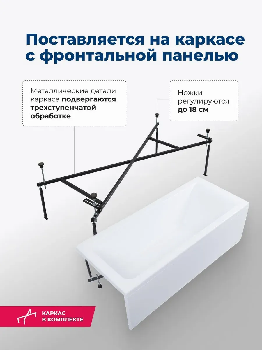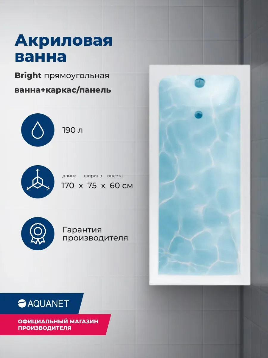 Акриловая ванна Aquanet Bright 347139 170x75 см с каркасом и фронтальной панелью купить