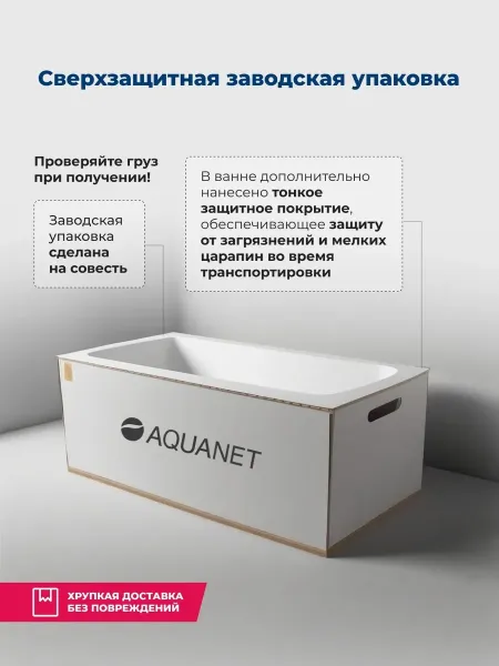 Акриловая ванна Aquanet создана с учетом растущего спроса на ванны простой прямоугольной формы в популярных размерах. Это модель с прямыми бортами и пологой спинкой, где соблюден идеальный угол для комфортного нахождения в ванне. Спинка плавно перетекает в бортик, поэтому релакс гарантирован даже без использования подголовника. Все линии ванны подчинены строгим законам эргономики. Чаша в этой ванне устроена таким образом, что для обозначенных размеров в ней достигнут максимально возможный внутренний объем, и это при комфортной глубине от слива ванны до борта. Ванна рассчитана на нагрузку свыше 300 кг, так что даже крепкий мужчина сможет без опаски находиться в ней. Двойной слой армирования обеспечивает надежность чаши, а закладные из МДФ-плит в местах наибольшей нагрузки усиливают эффект.
