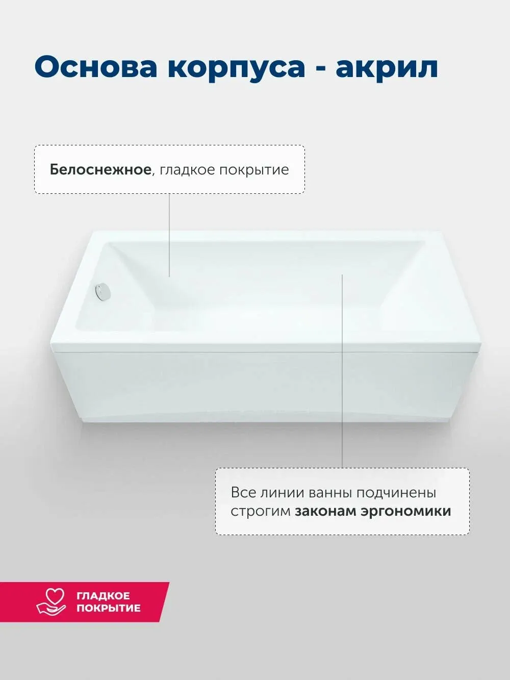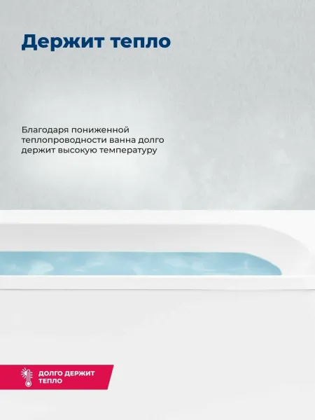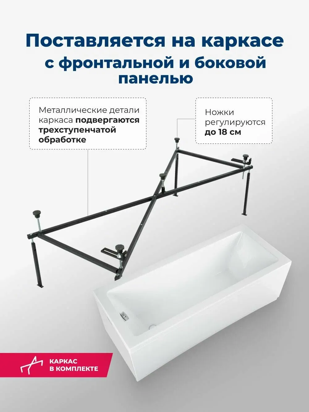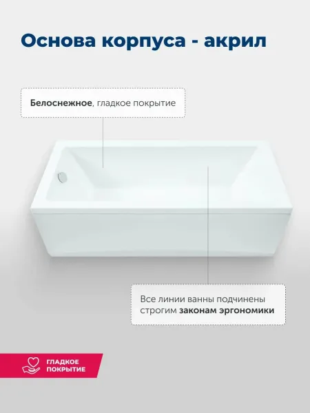 Пологая спинка спроектирована таким образом, что обеспечиваются комфорт и расслабление мышц тела. Расположение слива стандартное — в области ног. Модель установлена на прочный и устойчивый металлический каркас с регулируемыми ножками, позволяющими расположить ее на удобной высоте. Чтобы закрыть пространство под ванной, можно использовать панели: фронтальную и/или боковую.