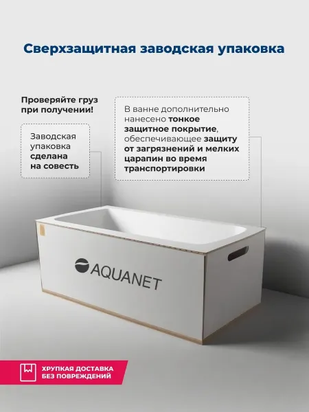 Акриловая ванна Aquanet - это маленькое море в белоснежных акриловых берегах, которое уместится в ванной комнате, где найдется свободное место. Для изготовления ванны использован сантехнический акрил толщиной 4 мм. Изделие укреплено армированием в несколько слоев стеклоровинга, благодаря которому оно надежно и без труда выдержит нагрузку в 300 кг.