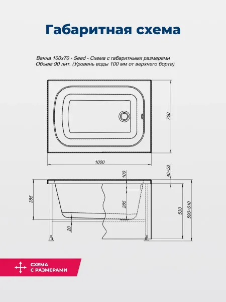 Акриловая ванна Aquanet Seed 100x70 - суперкомпактная модель, которая поместится даже в самом скромном по размерам помещении. В ширину она 70 см, а вот длину имеет необычно маленькую – всего 100 см. Принимать ванну взрослому человеку в ней можно только сидя. Впрочем, даже в таком положении при глубине 385 мм от слива ванны до борта в нее можно погрузиться всем телом. В ванну входит 90 литров воды. Маленькая ванна Seed по качеству не уступает своим более габаритным собратьям. Она сформована из сантехнического акрила европейского производства, покрыта для прочности двойным слоем стеклоровинга с установкой в местах наибольшей нагрузки закладных из МДФ-плиты. У нее широкие борта, которые подойдут для установки каскадного смесителя или которые можно использовать в качестве полочки для гигиенических средств. А поверхность чаши белоснежная и глянцевая, приятная на ощупь.