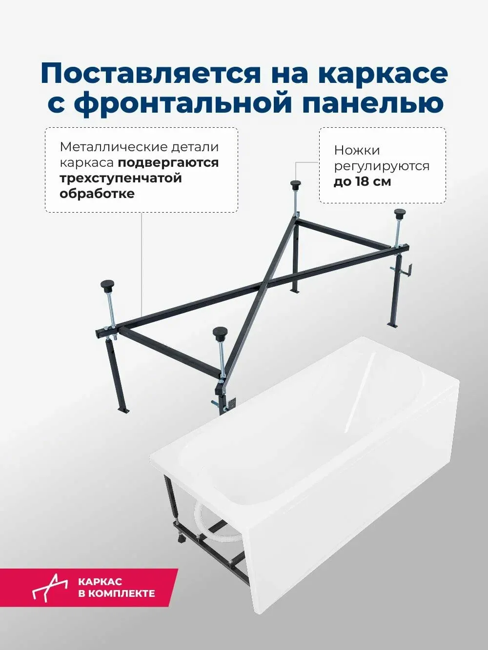 Ванна уже установлена на жесткий сварной каркас из металлического профиля. Металлические детали каркаса подвергаются трехступенчатой обработке, когда сначала профильная труба проходит абразивную зачистку на специальном станке, после чего готовые детали обрабатывают каустической содой, и, просушив, покрывают с помощью электростатического распылителя молотковой краской по металлу. Это гарантирует равномерность окрашивания и стойкость покрытия.