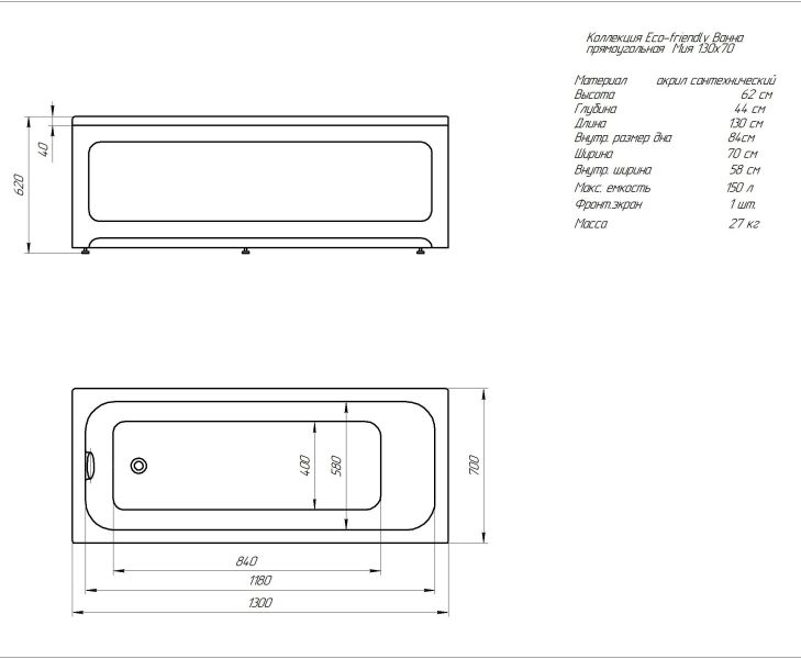 Габариты (Д Ш), см: 130х70Высота с опорой, см: 62Объем, л: 150 Форма: прямоугольнаяМонтаж: пристеннаяРасположение перелива: стандартноеДиаметр слива ванны, см: 5,2Материал: 100% литьевой акрилЦвет: белыйГарантия: 20 летСтрана: Россия Вид опоры: каркас сборно-разборный металлический (шпильки) или опорная конструкция (ножки), приобретается отдельноЭкран: фронтальный и боковой, приобретаются отдельноСлив-перелив: нет, приобретается отдельноАнтискользящее покрытие: нескользкая поверхность