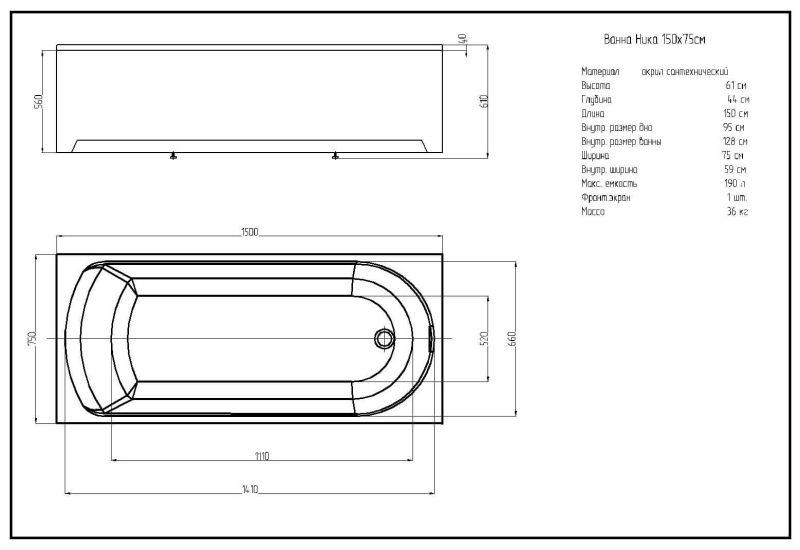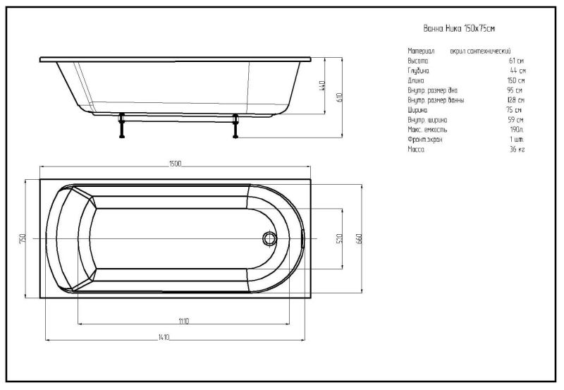 Габариты (Д Ш), см: 150х75Высота с опорой, см: 61Объем, л: 195 Форма: прямоугольнаяМонтаж: пристеннаяРасположение перелива: стандартноеДиаметр слива ванны, см: 5,2Материал: 100% литьевой акрилЦвет: белыйГарантия: 20 летСтрана: Россия Вид опоры: каркас сборно-разборный металлический (шпильки) или опорная конструкция (ножки), приобретается отдельноЭкран: фронтальный и боковой, приобретаются отдельноСлив-перелив: нет, приобретается отдельноНескользкая поверхность