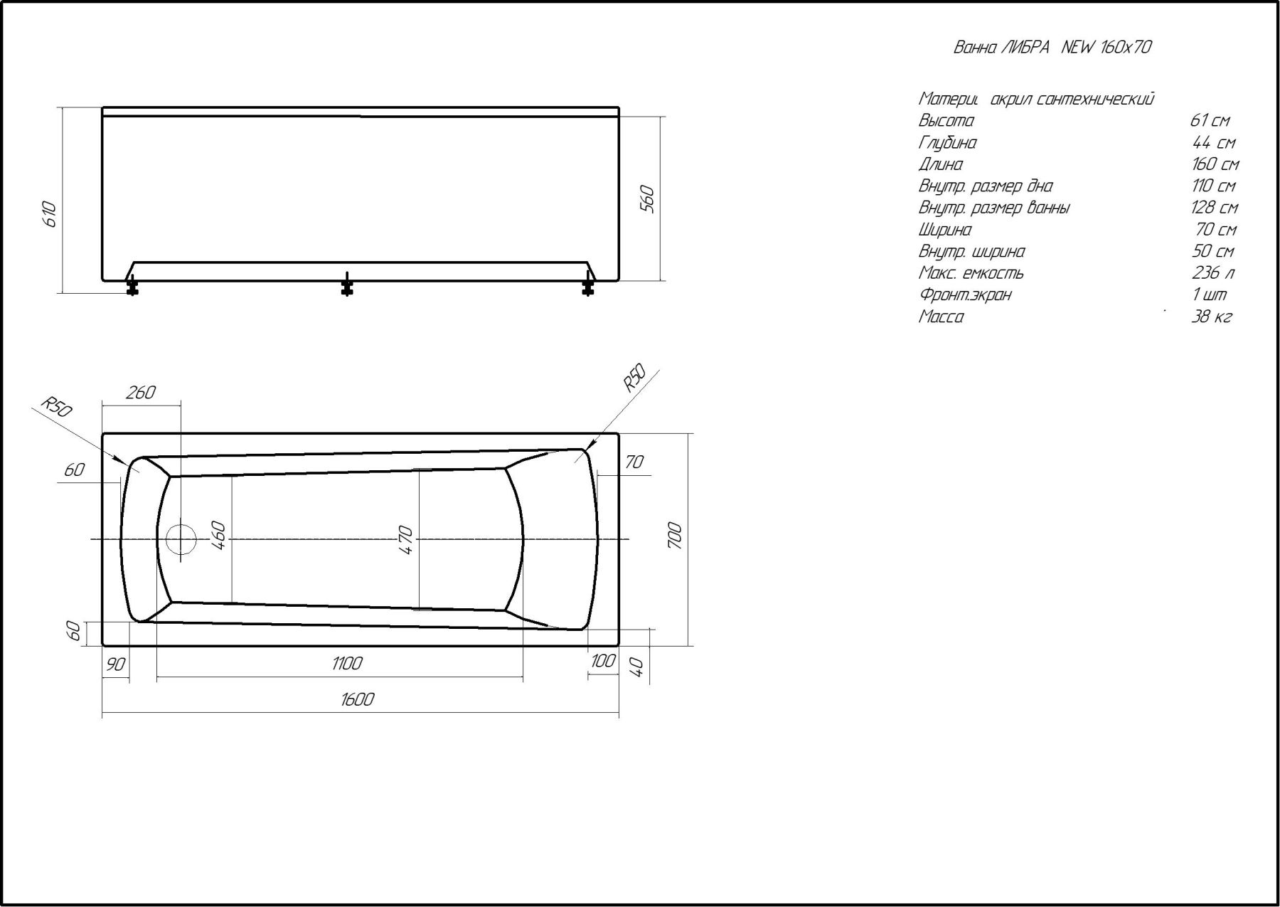 Габариты (Д Ш), см: 160х70Высота с опорой, см: 61Объем, л: 235 Форма: прямоугольнаяМонтаж: пристеннаяРасположение перелива: стандартноеДиаметр слива ванны, см: 5,2Материал: 100% литьевой акрилТолщина акрилового листа, мм: 4Гарантия: 20 летСтрана: Россия Вид опоры: каркас или опорные ножки, поставляются отдельноЭкран: фронтальный и боковой, приобретаются отдельноСлив-перелив: поставляется отдельноАнтискользящее покрытие: нескользкая поверхностьПодголовник: приобретается отдельноРучки: приобретаются отдельно Система гидромассажа: установка по желаниюАэромассаж: установка по желаниюХромотерапия: установка по желаниюРучки, поручни для ванны: установка по желаниюВстроенные смесители: установка по желаниюИзменение конструкции каркаса: установка по желаниюОзонирование: нет, установка не предусмотренаЗащита от сухого пуска: установка по желаниюУправление: любое по желанию