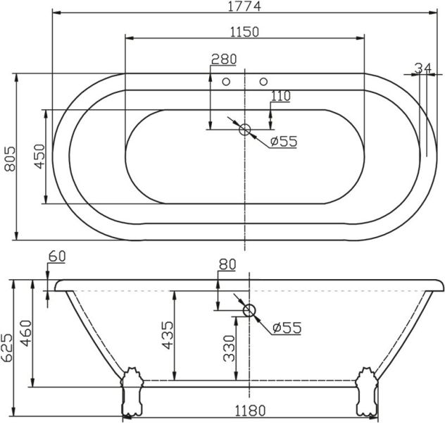 Расположение перелива: переливное и сливное отверстие по длинной стороне ванны, сливное отверстие смещено от середины к переливному отверстию