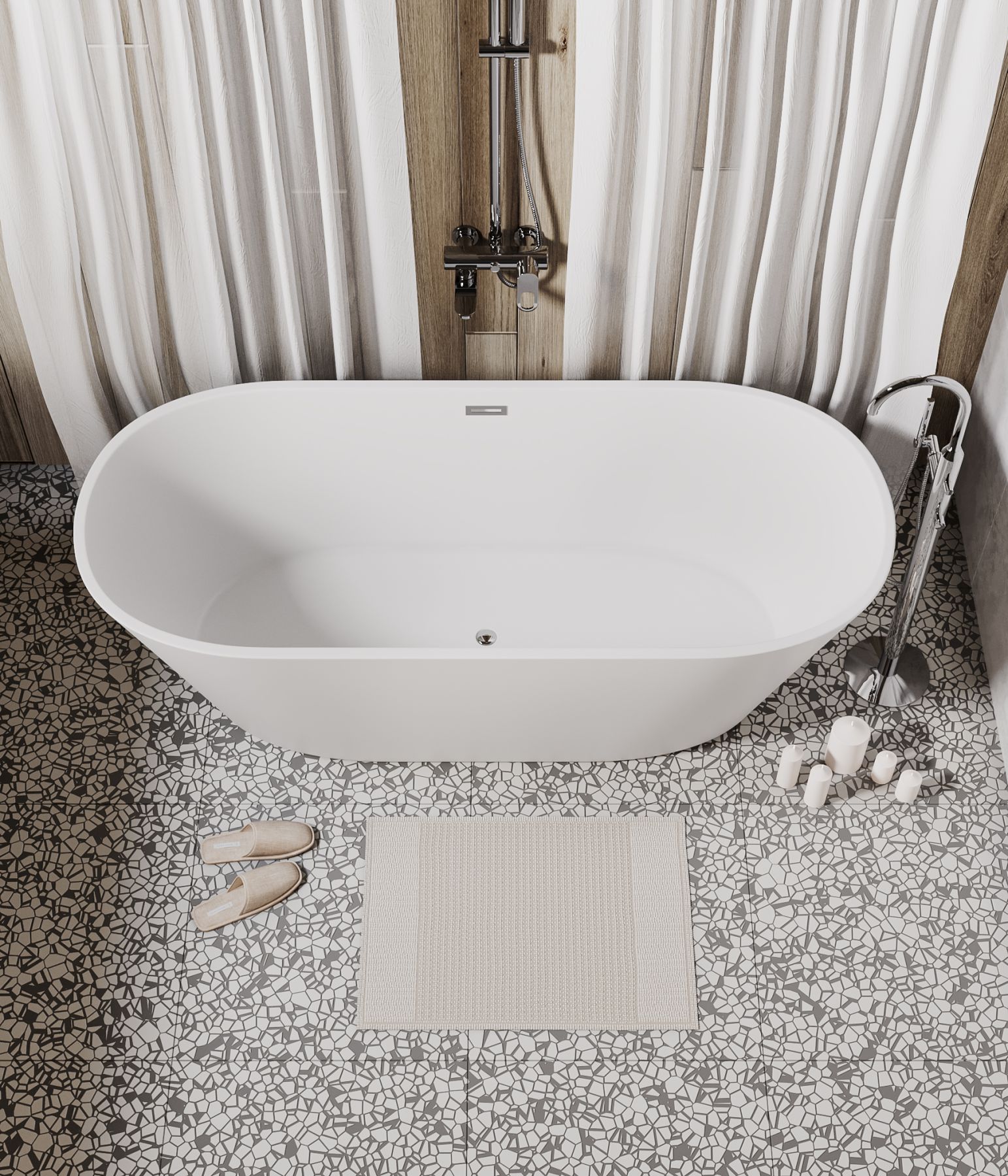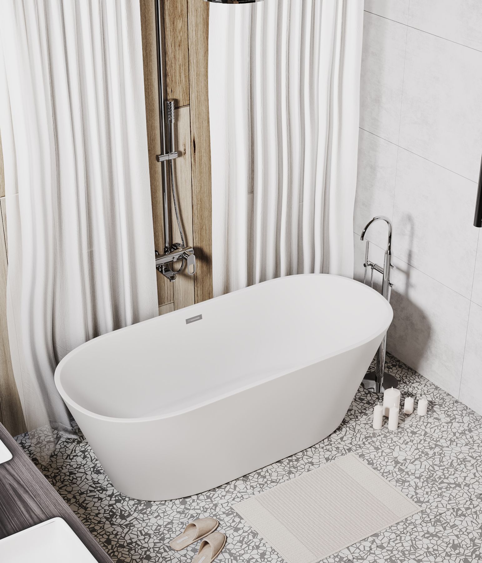 Ванна изготовлена из акрилового листа толщиной 5 мм, что обеспечивает прочность и долговечность изделия. Акриловый материал также приятен на ощупь и сохраняет тепло воды на длительное время, создавая комфорт при принятии ванны. Ванна выполнена в белом матовом цвете. Дополнительно, данная ванна обладает антибактериальным покрытием, которое предотвращает размножение бактерий и обеспечивает гигиеничность использования. Усиленный каркас ванны обеспечивает стабильность и надежность конструкции, что позволяет использовать ванну без опасений и сомнений. Четырехслойная армировка ванной усиливает ее прочность и структурную целостность, что делает ее стойкой к воздействию внешних факторов и повышает ее долговечность. Эта отдельностоящая ванна сочетает в себе функциональность, надежность и эстетическое привлекательность, создавая идеальное пространство для релаксации и ухода за собой в вашей ванной комнате.