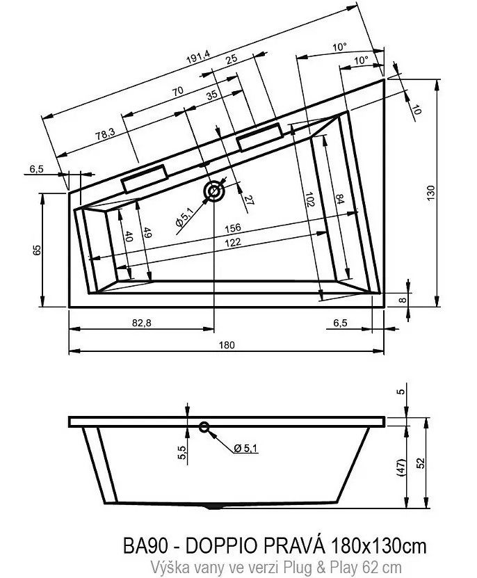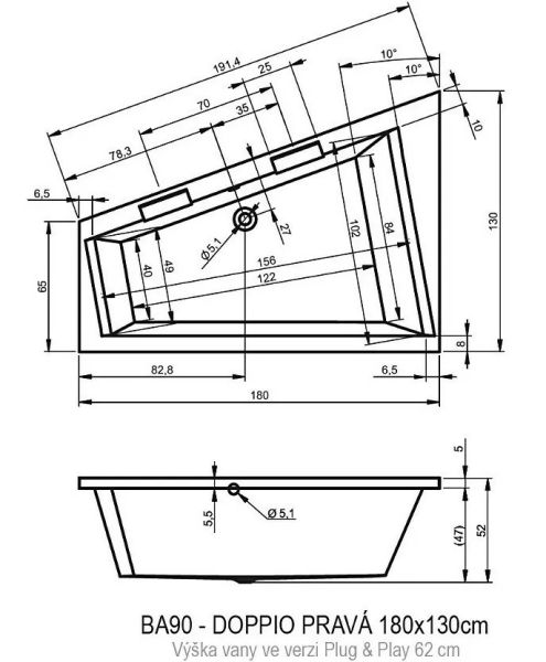 Асимметричная ванна RIHO Doppio 180x130 R Plug & Play из глянцевого белого акрила, со скошенными краями представляет собой полностью собранную на заводе конструкцию.