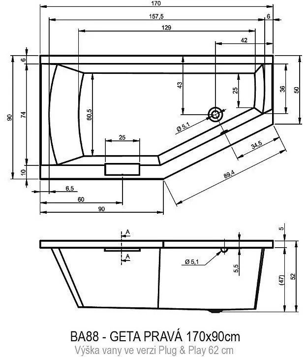 ?Асимметричная ванна RIHO Geta 170x90 R Plug & Play из глянцевого белого акрила, со скошенными краями и встроенной хромированной ручкой представляет собой полностью собранную на заводе конструкцию.