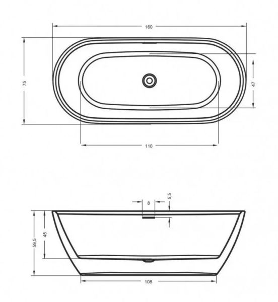 Отдельно стоящая, матовая белая акриловая ванна RIHO Inspire 160х75 с двойными стенками, со встроенным переливом и нажимным донным клапаном.