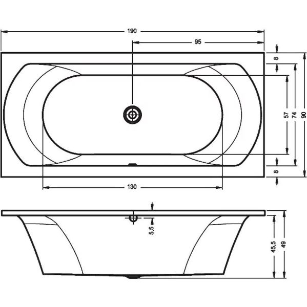 Дно широкое и почти полностью плоское, что позволяет удобно стоять в этой ванне.