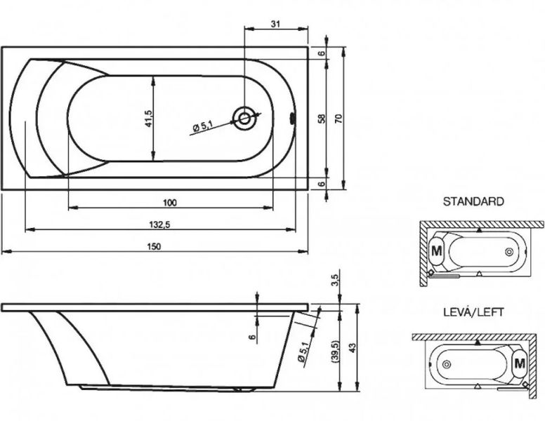 Конструкция ванны симметрична, поэтому может быть установлена в правом и левом углу.