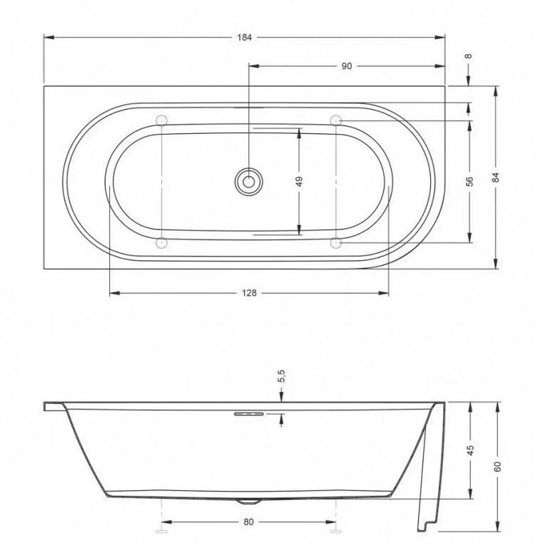Белая глянцевая ванна поставляется в стандартной комплектации с хромированным сливом переливом