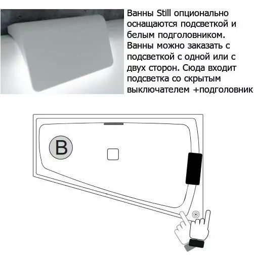 перелив). Тогда отдельный кран не потребуется. Подголовник выполнен с LED-подсветкой. Глянцевый белый слив-перелив и подголовник входят в комплектацию ванны.