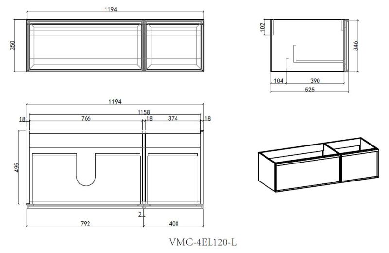 База под раковину Vincea Elise 1200 подвесная, левая, 2 выкатных ящика soft-close, серый матовый