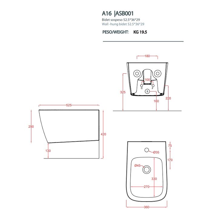 Биде Artceram A16 ASB001 41 00 materaArtceram A16 Биде подвесное 52,5х36см, 1 отв под смеситель, цвет: matera