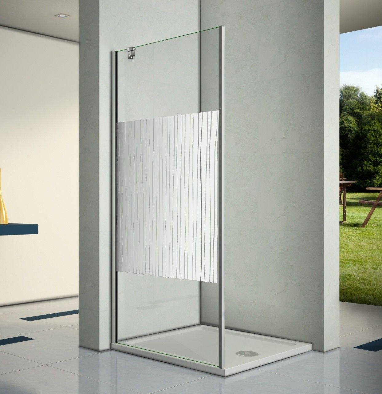 Ширина:90 смВысота:185 смВес:29 кгСтенки:стекло, 6 мм, прозрачное с узоромПрофиль:алюминий, хром