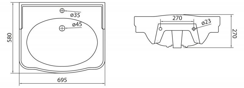 •Габаритные размеры чаши раковины: 69,5x58x27см