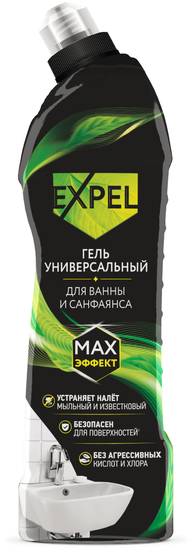 Баланс эффективности и безопасности геля достигается за счет применения лимонной кислоты. Благодаря своим свойствам эта природная кислота отлично очищает загрязнения и абсолютно безопасна для эмали и металлических поверхностей. Универсальный гель Expel подходит для всех типов поверхностей: