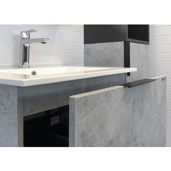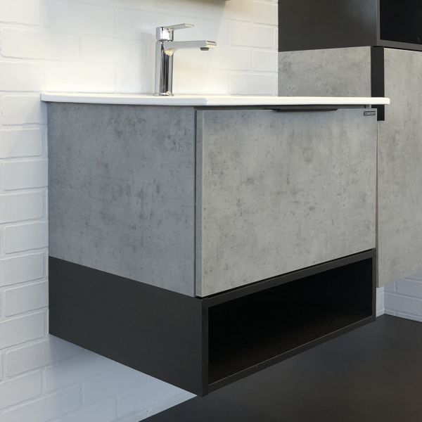 Тумба-умывальник в современном стиле с выкатным ящиком и пространством для открытого хранения. Тумба укомплектована черной матовой алюминиевой ручкой и системой плавного закрывания ящика. Тумба подготовлена для подключения водоснабжения снизу.