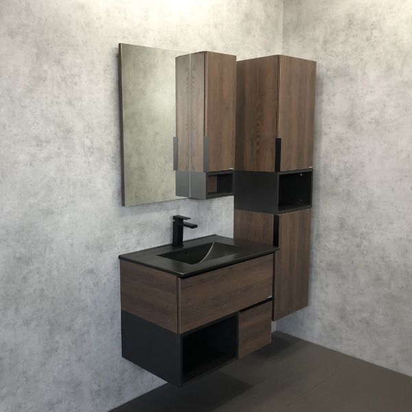 Comforty Тумба-умывальник "Франкфурт-75" дуб шоколадно-коричневый с раковиной COMFORTY 75E черная матовая
