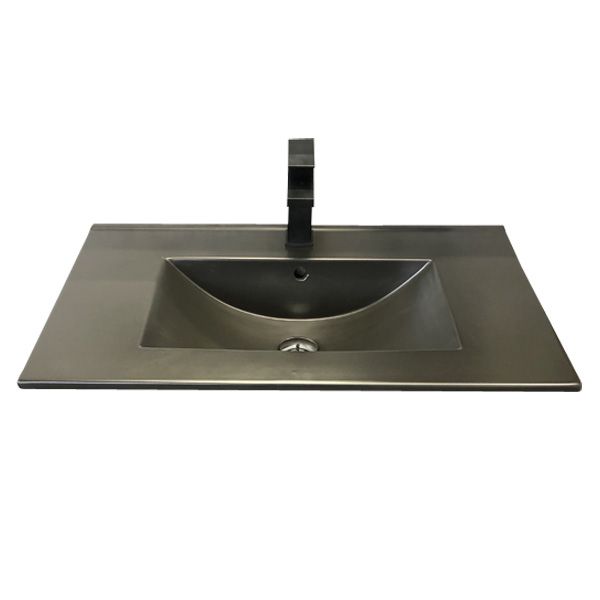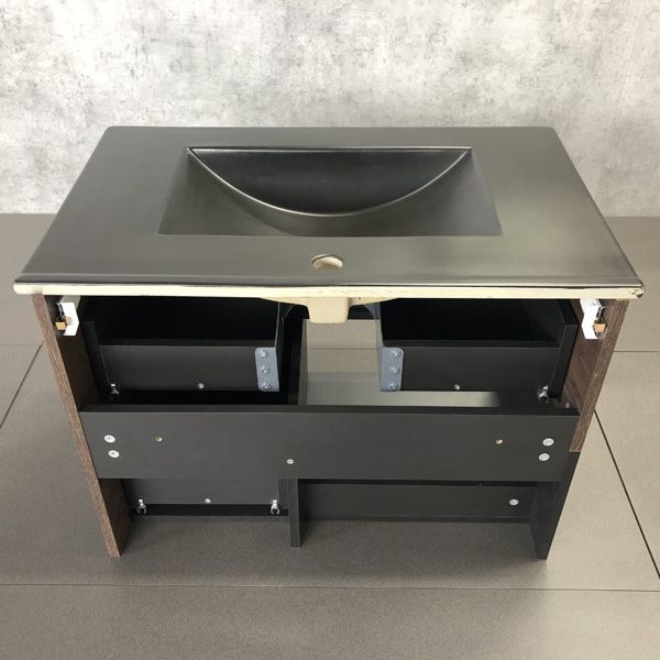 Тумба-умывальник в современном стиле с двумя выкатными ящиками и пространством для открытого хранения. Ящики оснащены системой плавного закрывания. Тумба укомплектована черными матовыми алюминиевыми ручками и столешницей и черной накладной прямоугольной раковиной из санфарфора. Тумба подготовлена для подключения водоснабжения снизу.