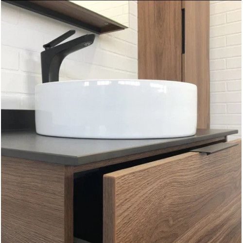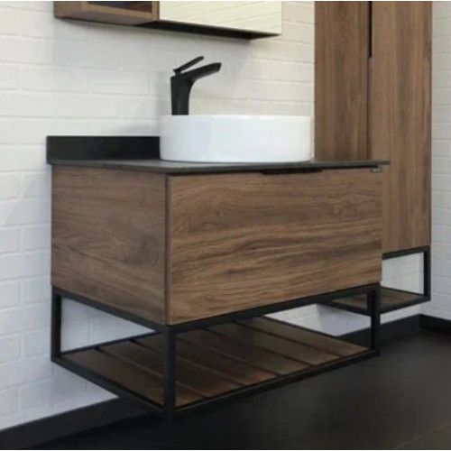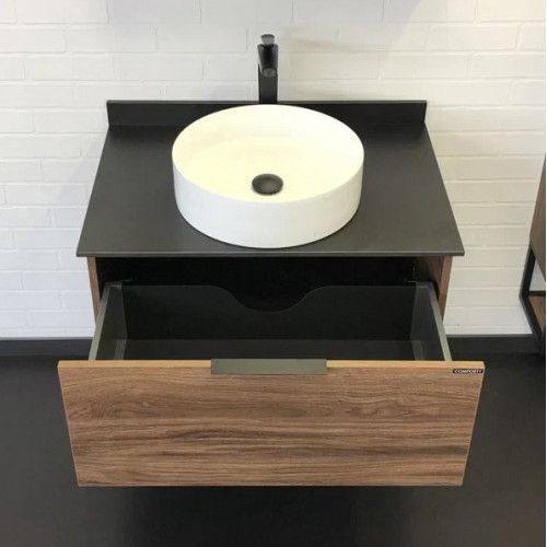 COMFORTY Тумба-умывальник Порто 75 00-00008926Подвесная тумба-умывальник с одним выкатным ящиком оснащенным системой плавного закрывания и нижней полкой открытого хранения. В основе тумбы - каркас из стального профиля. Тумба выпускается в следующих сочетаниях: ВЛДСП - Дуб темно коричневый, каркас - черный муар, черный керамогранит; либо ВЛДСП - дуб дымчатый, каркас - серый графит, белый керамогранит.