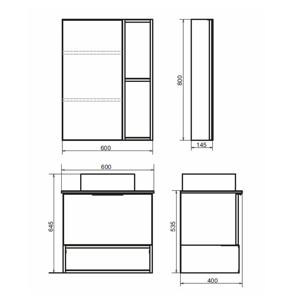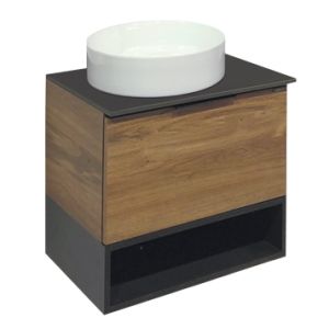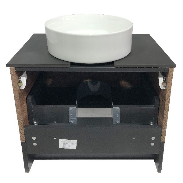 Тумба-умывальник в современном стиле с выкатным ящиком и пространством для открытого хранения. Ящик оснащен системой плавного закрывания. Тумба укомплектована черной матовой алюминиевой ручкой, столешницей из черного керамогранита и накладной круглой раковиной из санфарфора. Тумба подготовлена для подключения водоснабжения снизу.