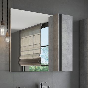 Створка оснащена системой push-to-open (открытие при нажатии). Высококачественное зеркальное полотно с амальгамой на основе серебра. Фасад и корпус из влагостойкого ЛДСП Бетон светлый. За створкой две горизонтальные полки. Название: Зеркало-шкаф