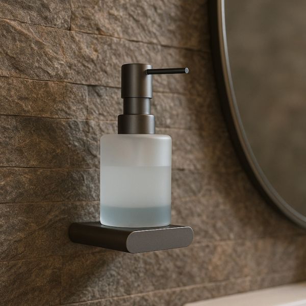 Прочный дозатор в цвете вороненой стали с матовым стеклом: мягкий, надежный механизм подачи выдает оптимальную порцию мыла, легко устанавливается и долговечен. Объем 200мл.
