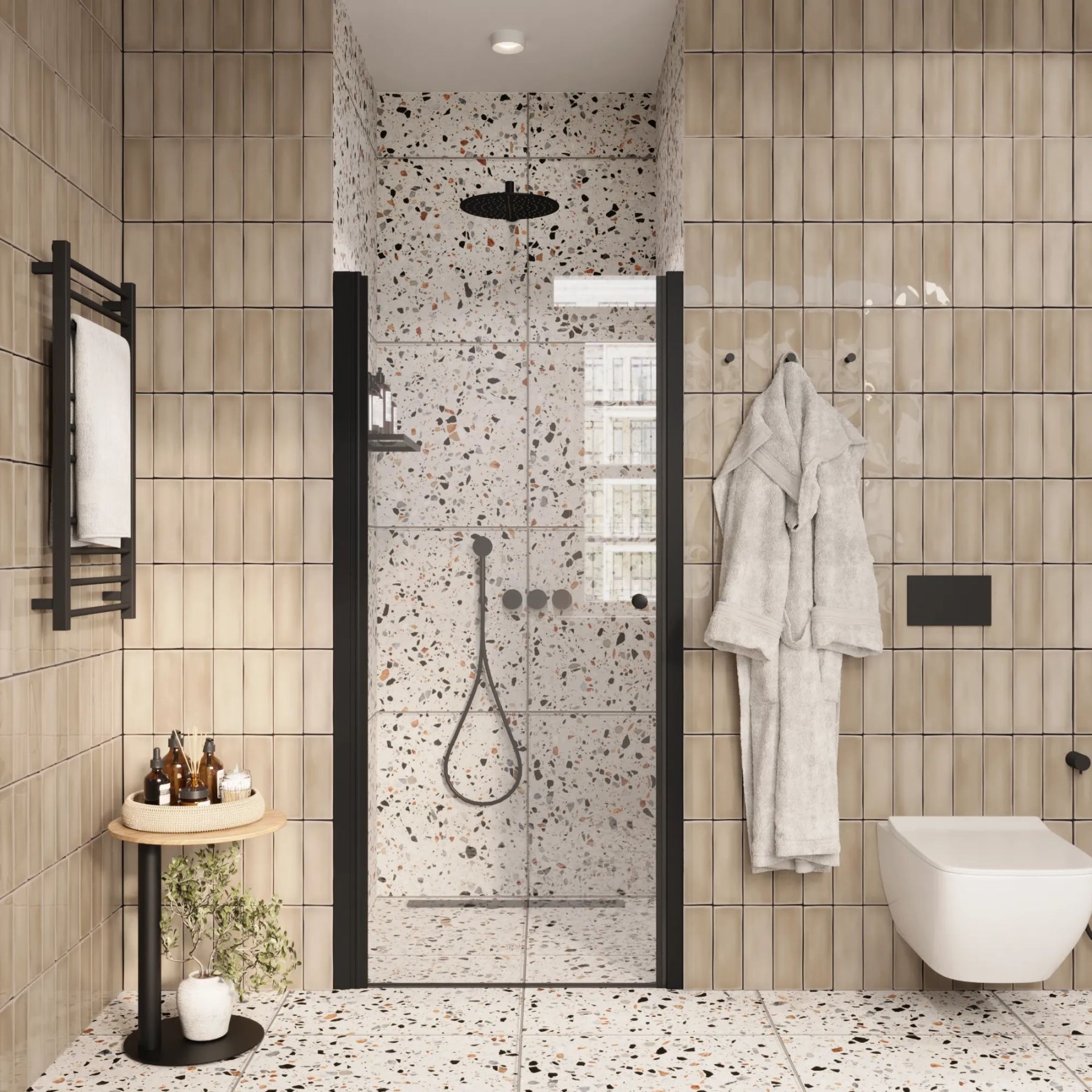 Душевая дверь помогает зонировать помещение на отдельные функциональные участки.