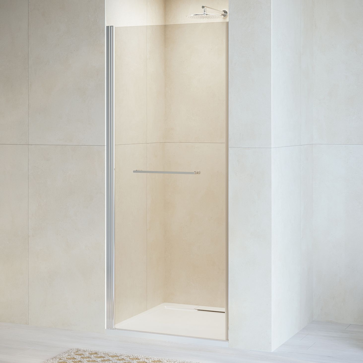 Душевая дверь распашная с маятниковой петлей (открытие только наружу). Маятниковые петли с функцией подъема двери. В комплекте нижняя пороговая планка. Стальная ручка - полотенцедержатель. Трап или поддон приобретается отдельно.