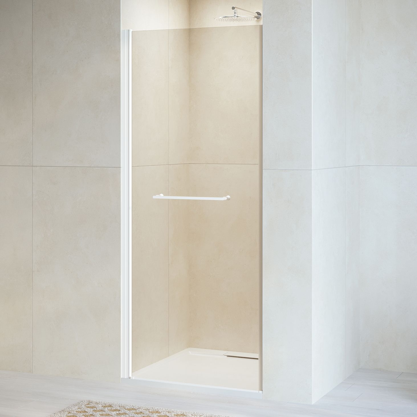 Душевая дверь распашная с маятниковой петлей (открытие только наружу). Маятниковые петли с функцией подъема двери. В комплекте нижняя пороговая планка. Стальная ручка - полотенцедержатель. Трап или поддон приобретается отдельно.