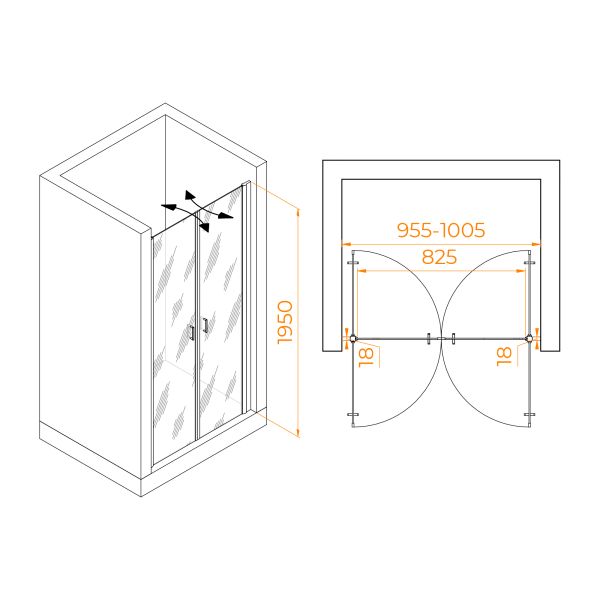 Душевая дверь распашная двустворчатая маятниковая. Маятниковые петли с функцией подъема двери. В комплекте нижняя пороговая планка. Трап или поддон приобретается отдельно.