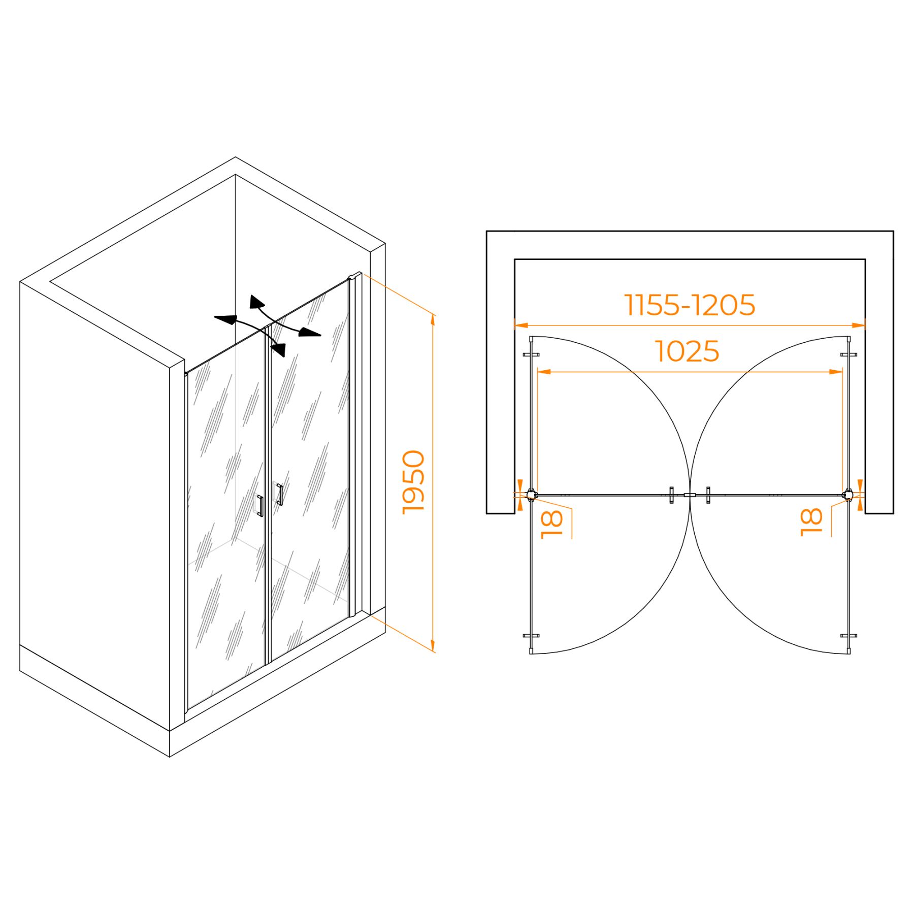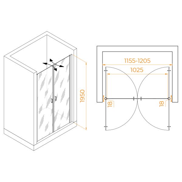 Душевая дверь распашная двустворчатая маятниковая. Маятниковые петли с функцией подъема двери. В комплекте нижняя пороговая планка. Трап или поддон приобретается отдельно.