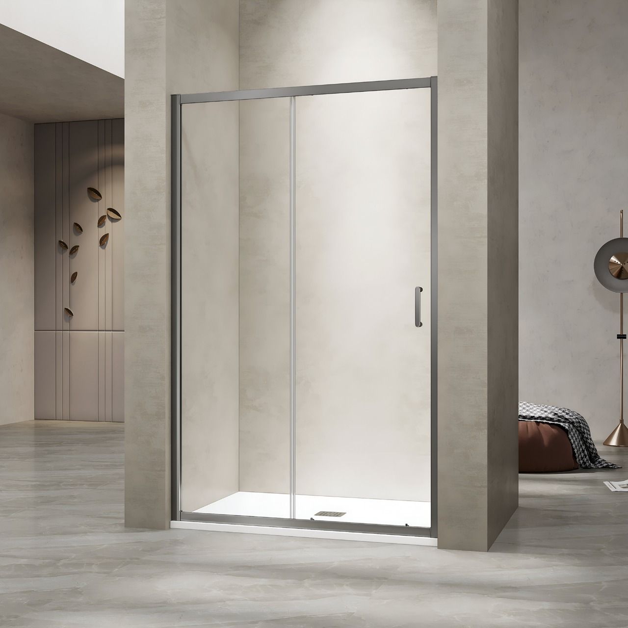 Идеальное решение для ниши.Душевая перегородка с раздвижной дверью создает аккуратную прямоугольную душевую зону, эффективно ограждая водяной поток.