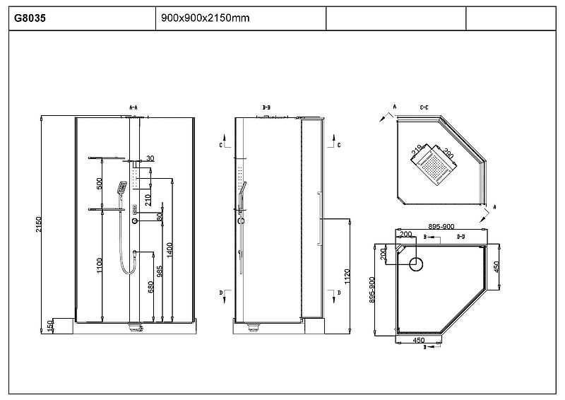 Габариты душевой кабины (ШхВхД): 900х2150х900 мм.