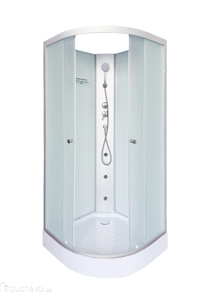 Каркас выполнен из алюминия с матовым хромированным покрытием, а задние стенки и двери сделаны из матового закаленного стекла толщиной 4 мм, обеспечивающего высокую прочность и безопасность. Поддон низкий (высота 15 см), изготовлен из акрила белого цвета, что упрощает вход в кабину и ухаживание за ней.