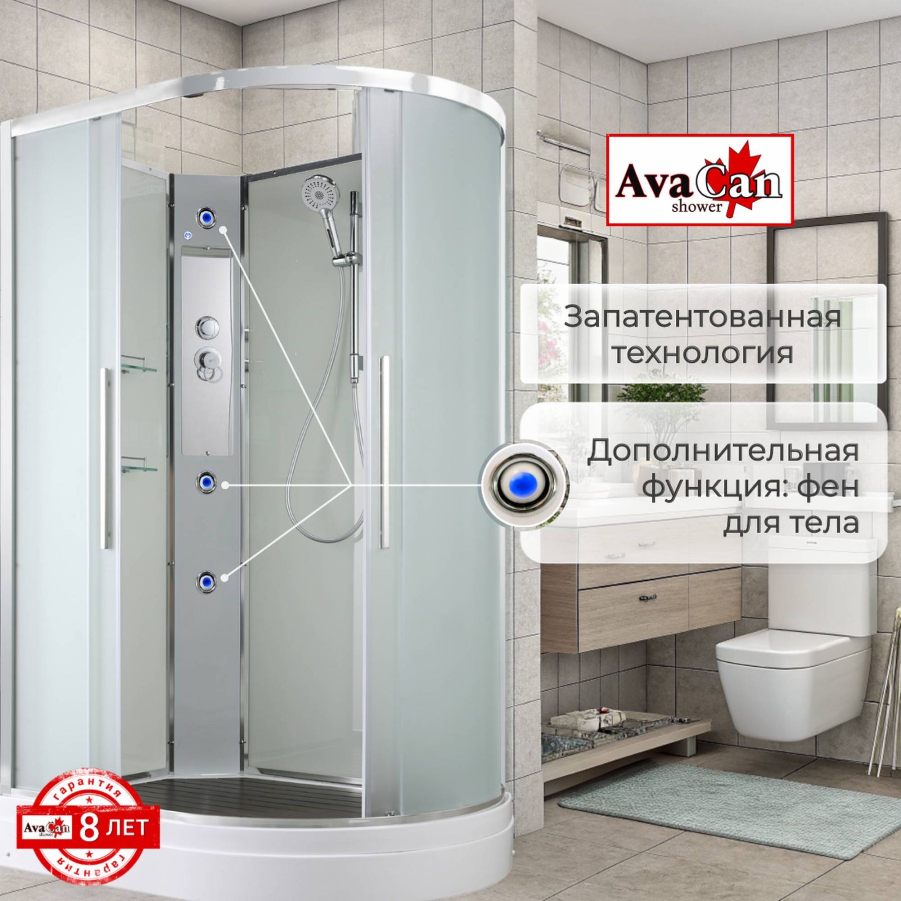 Стильная душевая кабина AvaCan EM2912LN сочетает в себе высокую функциональность, практичность и надежность. При изготовлении применяется безопасное закаленное стекло толщиной 5 мм (матовое), надежно фиксируемое алюминиевым профилем. Сборка без силикона (увеличивает срок службы), внутренняя сборка(облегчает установку и ревизию; позволяет установить в ограниченном пространстве), смеситель резьбовой (без хомутов). Съемный экран поддона (позволяет осуществлять ревизию сифона). Цвет профиля хром. Двойные металлические ролики дверей (увеличивают срок службы).В комплекте : душевая штанга, две полочки , арома-лейка с витамином С (картридж съемный),полимерная вставка в поддон(имитация дерева),сифон, ручки дверей из нержавейки , двойные ролики .