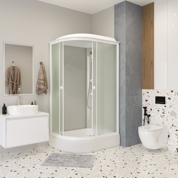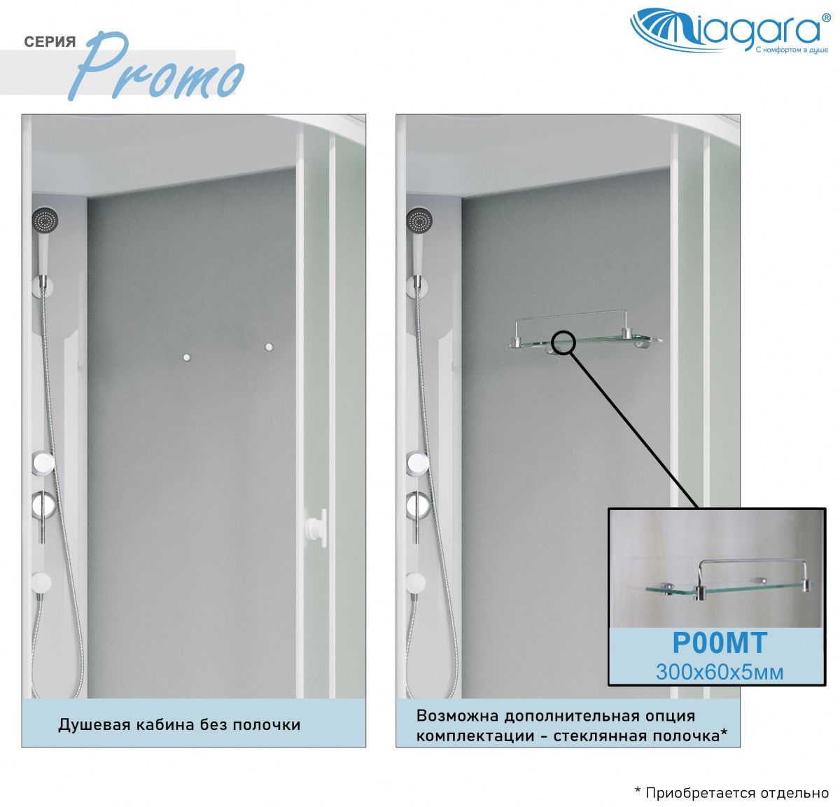 Душевая кабина Niagara Promo P120/80/26R/MT праваяБессиликоновая душевая кабина Niagara Promo P120/80/26R/MT ПраваяРазмеры 120x80x215 см Душевая кабина, в простой комплектации серия Promo, основные функции тропический душ и ручная лейка. Поддон акриловый на железном каркасе, высота поддона от пола 26 см, внутренняя глубина чаши 13 см. Чаша поддона установлена на металлический каркас, с регулируемыми ножками. Нагрузка на поддон до 300 кгСтенки задние закаленное стекло 4 мм - белое матовое. Стенки передние закаленное стекло 4 мм - белое матовое.Смеситель латунь с керамическим картриджем (устойчивый к плохой воде - гарантия 10 лет)На крыше расположен тропический душ.Ручная лейка устанавливается на любую высоту (держатель в комплекте)