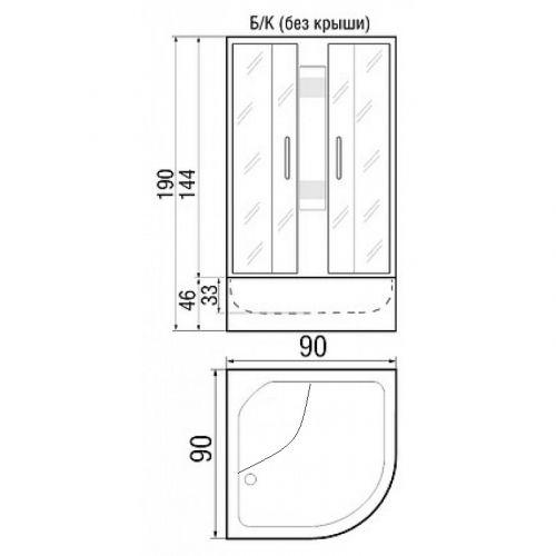 ~ без крыши ~ цент. стойка ~ ручной душ 3-х позиц. ~ держатель д/лейки ~ смеситель ~ поддон п/кр выс. со сьемным экраном(Н=46 см) ~cифон