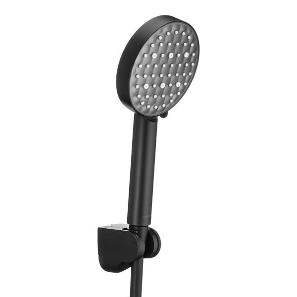 Душевой набор Диаметр лейки 120 мм.3 режима.Форсунки из силикона с функцией самоочистки.Гипоаллергенный пластик.Многопозиционный кронштейн.Шланг PVC 1,75 м.Цвет: черный.
