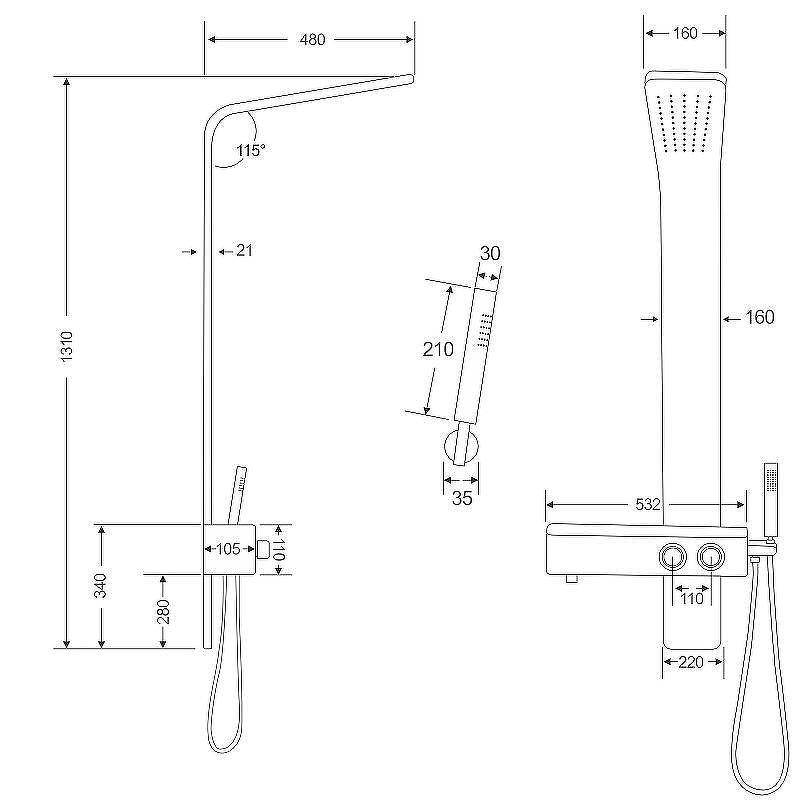 Размер ручного душа (ШхВ): 30х210 мм.