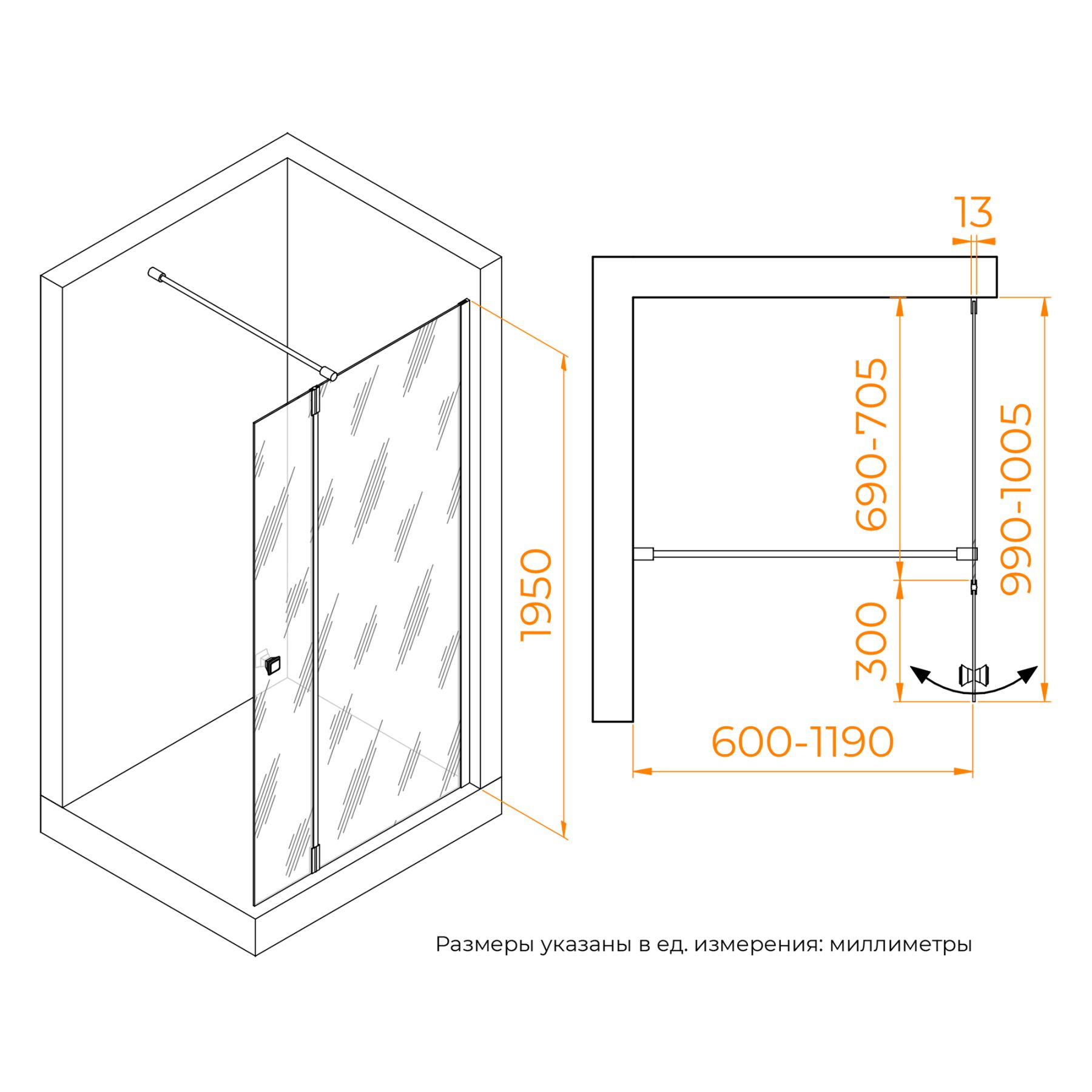 Душевая перегородка состоит из стационарного полотна и полотна с поворотной маятниковой частью - 300 мм. Стационарное стекольное полотно крепится к стене алюминиевым профилем с декоративной заглушкой. Подвижное полотно закреплено стальной маятниковой петлей с ходом 180 градусов.Перегородка выпускается с фурнитурой в 3-х вариантах: