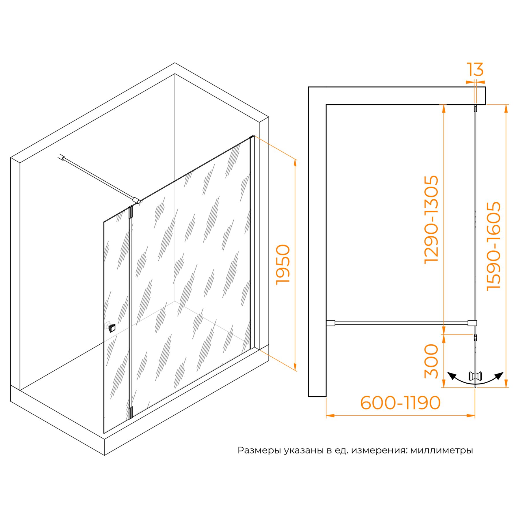 Душевая перегородка состоит из стационарного полотна и полотна с поворотной маятниковой частью - 300 мм. Стационарное стекольное полотно крепится к стене алюминиевым профилем с декоративной заглушкой. Подвижное полотно закреплено стальной маятниковой петлей с ходом 180 градусов.Перегородка выпускается с фурнитурой в 3-х вариантах: