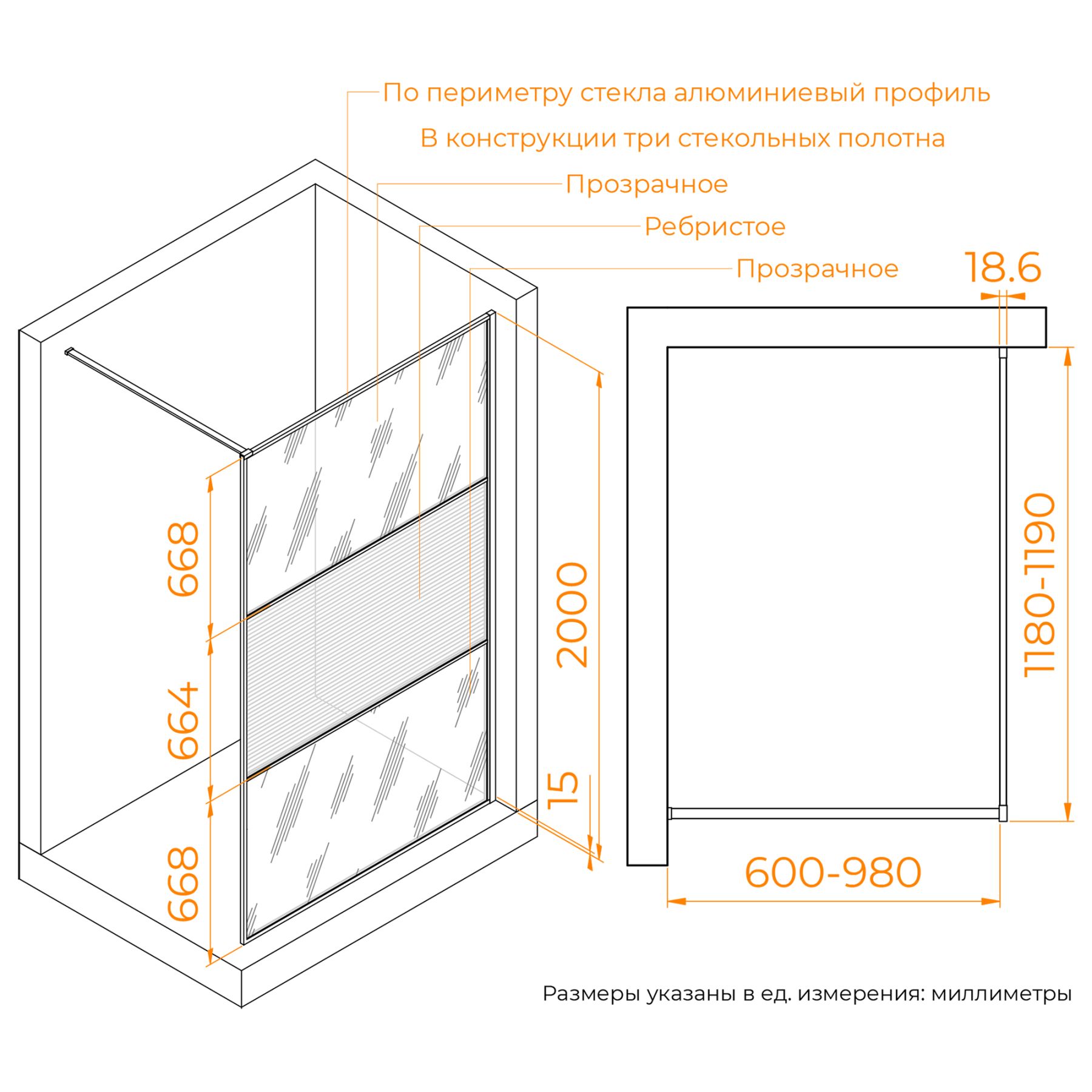 Главное преимущество данной модели — минимальная упаковка в виде чемоданчика с ручкой. Это позволяет легко и удобно транспортировать душевую перегородку!Душевая перегородка состоит из 3-х стекольных полотен (8мм), которые обрамлены изящным анодированным алюминиевым профилем!Штанга из стали S304, крепится к стене, она обеспечивает стабильность душевого ограждения. Длина стальной штанги 1000 мм, при этом ее всегда можно укоротить путем обычной подрезки.В конструктив модели возможно добавить тканевую водонепроницаемую шторку, при этом варианте использовать Штангу - кронштейна как карниз.Модели представлены в трендовых цветовых решениях профиля: