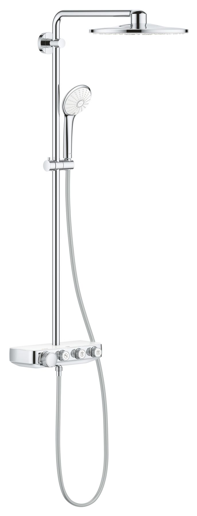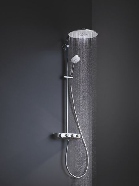 Душевая система Grohe Euphoria SmartControl System 26507LS0 хромПревратите свою ванную в роскошное современной место с помощью душевой системы, которая порадует вас невероятным, исключительным опытом принятия душа.Инновационная технология GROHE SmartControl позволяет переключаться между режимами струи и комбинировать потоки верхнего и ручного душа, равно как и регулировать напор воды с помощью простого нажатия и поворота кнопки. Технология EcoJoy позволяет сократить расход воды.Верхний душ диаметром 310 мм имеет два режима струи: мягкий и обволакивающий режим Rain и стимулирующий, мощный режим ActiveRain. В ручном душе диаметром 110 мм - три режима струи: нежный Rain, водосберегающий SmartRain и восстанавливающий Massage.Технология GROHE DreamSpray гарантирует, что из каждой форсунки будет идти одинаковый напор воды. Силиконовые форсунки SpeedClean спроектированы так, чтобы их можно было легко очистить от известковых отложений. Технология GROHE TurboStat гарантирует постоянную температуру воды из вашего душа. GROHE SafeStop позволяет установить максимальную температуру на 38?C, а SafeStop Plus предлагает увеличить ограничение температуры до 43?C. Для дополнительной безопасности технология GROHE CoolTouch гарантирует, что корпус термостата не будет слишком горячим для прикосновения.Полочка EasyReach добавит в ваш душ практичности, ведь шампунь и мыло всегда будут у вас под рукой.Надежная и ослепительная хромовая поверхность GROHE StarLight сохранит свой великолепный внешний вид на долгие годы. Благодаря системе GROHE QuickFix установка системы будет простой и быстрой, ведь кронштейн можно установить в уже существующие отверстия в стене.GROHE Euphoria SmartControl - насладитесь интуитивным управлением и комфортом роскошного душа.