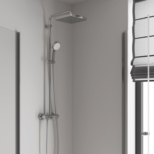 Душевая система Grohe Tempesta Cosmopolitan 26693000 хромс укороченной душевой штангой для использования в душевых кабинахВключает в себя:горизонтальный душевой кронштейн 355 ммоднорычажный смеситель для ванны с переключателем, настенный монтажвыбор между:верхний душ Tempesta Cube 250х250 ммдушевая струяRain с технологией GROHE DripStopтыльная часть головки верхнего душа белаяс шаровым шарниромугол поворота ± 10°излив для ванныотдельный переключатель на ручной душручной душ Tempesta Cosmopolitan 100 (27 573)4 вида струй:GROHE Rain O2, Rain, Massage, Jetрегулируется по высоте с помощью скользящего элементадушевой шланг, 1.750 мм 1/2" x 1/2" (28 410)GROHE SilkMove керамический картридж Ø 46 ммGROHE DreamSpray превосходный поток водыGROHE StarLight хромированная поверхностьGROHE DripStop практически полное отсутствие капель после выключения воды (верхний душ)SpeedClean система против известковых отложенийвнутренний охлаждающий канал для продолжительного срока службыTwistStop против перекручивания шлангасовместим с проточным водонагревателем только выше 18 кВ/ч, а также с накопительным водонагревателем (см. Техническую информацию)минимальный расход воды 7л/минминимальное давление 1,0 бар